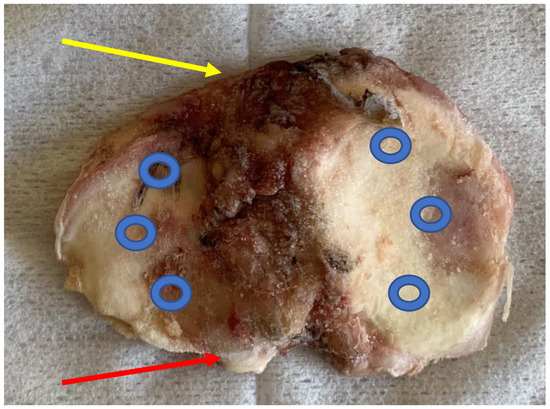 Prepared tibial condyle. Yellow arrow—anterior part of the condyle; red arrow—posterior part of the condyle. Blue rings—places of the bone blocks collection. Source: proprietary material.
