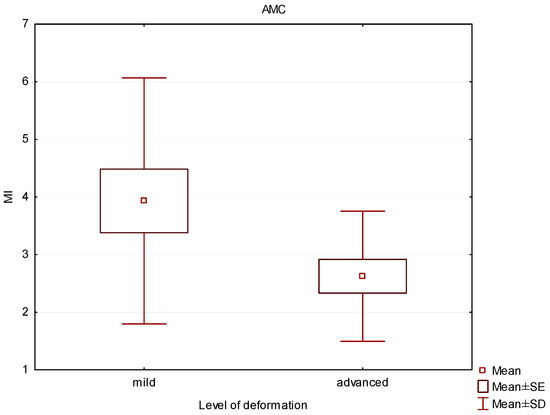 Box and whisker plot of the mineralization index (MI) in patients with mild and advanced deformity in the anterior part of the medial condyle (AMC).