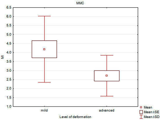 Box and whisker plot of the mineralization index (MI) in patients with mild and advanced deformity in the medial part of the medial condyle (MMC).