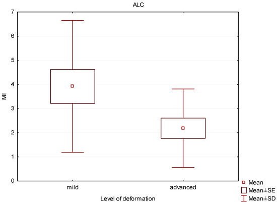 Box and whisker plot of the mineralization index (MI) in patients with mild and advanced deformity in the anterior part of the lateral condyle (ALC).