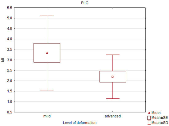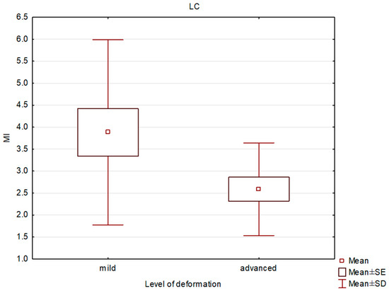 Box and whisker plot of the mineralization index (MI) in patients with mild and severe deformities in the lateral condyle (LC).
