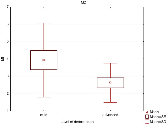 Box and whisker plot of the mineralization index (MI) in patients with mild and severe deformities in the medial condyle (MC).
