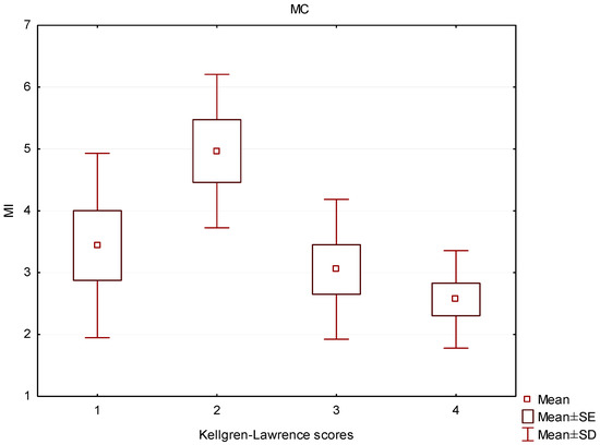 Box and whisker plot of the mineralization index (MI) in patients with different Kellgren–Lawrence scores in the medial condyle (MC).
