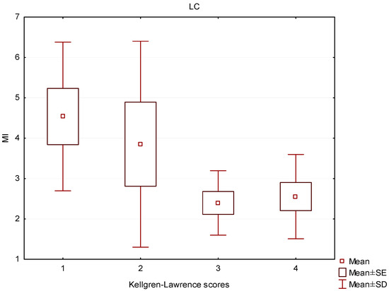 Box and whisker plot of the mineralization index (MI) in patients with different Kellgren–Lawrence scores in the lateral condyle (LC).