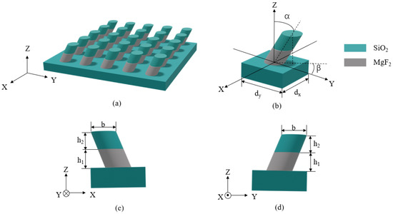 The proposed 2D grating has a structure of a slanted two-layered nano-cylinder array, as shown in Figure 1a. The material of the bottom layer is MgF2 with a height of h1. The material of the top layer is SiO2 with a height of h2. The materials are chosen as their refractive indices are not sensitive to wavelength in the visible range, and their manufacture is cost effective. The refractive indices of MgF2 and SiO2 at the operating wavelength of 450 nm are 1.38 and 1.46, respectively. MgF2 crystal is widely used, and MgF2 is the transparent solid material with the smallest refractive index (n = 1.38). In addition, the extinction coefficient of MgF2 is quite small in a large spectral range, which can decrease the reflection. Moreover, this material has a high laser-damage threshold [26,27,28]. The substrate material of the grating is SiO2, which is the same as that of the top layer. The proposed 2D gratings are shown in Figure 1b–d, with the grating ridge width b, grating period d, grating polar angle α, grating azimuthal angle β, and duty cycle f. To ensure the polarization-independent properties of the 2D grating, the periods are set to be equal in the x- and y-axis directions, d = dx = dy, and the grating azimuthal angle β is 45 degrees. Duty cycle f is defined as the ratio of the ridge width to the period of the grating, which can be expressed as f = b/d, so f = fx = fy. The incident layer and grating slots above the grating structure are filled with air media.