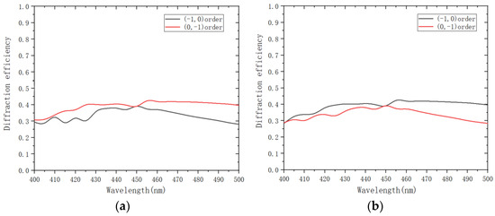 The wavelength bandwidth of a grating is a range of wavelengths over which the grating can operate effectively. A wider bandwidth means that the grating can be applied to a wider range of wavelengths, such that it is necessary to analyze the bandwidth of the grating for both polarizations. In Figure 2, we plot the diffraction efficiencies of the (−1, 0) and (0, −1) orders at a range of wavelengths from 400 nm to 500 nm for TE and TM polarization, respectively. Figure 2a shows the efficiencies of the diffraction orders (0, −1) and (−1, 0) for TE polarization incidence, and Figure 2b shows the efficiencies of (0, −1) and (−1, 0) for TM polarization incidence. We can see that the (−1, 0) order diffraction efficiency and (0, −1) order diffraction efficiency are both greater than 30% when the grating is operated in the range of 403 nm–490 nm wavelengths. In particular, the (−1, 0) order diffraction efficiency and the (0, −1) order diffraction efficiency are both higher than 35% at operating wavelengths of 429–468 nm. Hence, the 2D slanted gratings can be used in the wavelength of the red wave band.