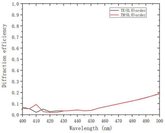 Figure 3 depicts the efficiency of (0, 0) versus wavelength under normal incidence for TE and TM polarization. We should decrease the efficiency of the 0th order to reduce the loss. The diffraction efficiencies of the (0, 0) order for TE and TM polarization are both less than 10% when the incident wavelength is in the range of 400 nm to 470 nm. In particular, the (0, 0) order diffraction efficiencies for TE and TM polarization are both less than 5% at operating wavelengths from 420 nm to 450 nm.