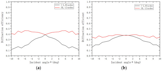 Due to the characteristics of the existing fabrication technique, it is more difficult to control the duty cycle than the period or the height of the grating in the process of fabricating the grating. Therefore, it is necessary to calculate the production tolerance for the duty cycle and discuss the deviation of the duty cycle from the designed optimal values. In Figure 8, we show a tolerance calculation for the duty cycle, such that Figure 8a is for TE polarization incidence, and Figure 8b is for TM polarization incidence. In the region of interest, the (−1, 0) order diffraction efficiency and the (0, −1) order diffraction efficiency both exceed 35% when the duty cycle is in the range of 0.46 to 0.53. In this range, the grating ridge width range b is 277.38 nm to 319.59 nm when the grating period d is equal to the optimal value of 603 nm. The tolerance range of the ridge width of the grating is 42.21 nm. With the grating ridge width b in this range, the sum of the grating (−1, 0) order diffraction efficiency and (0, −1) order diffraction efficiency will be greater than 70%. Moreover, we can see that the diffraction efficiency of the (−1, 0) and (0, −1) orders decreases rapidly when the duty cycle is greater than 0.53, regardless of whether the incident wave is in the TE or TM polarization state.