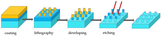 For general rectangular gratings, they are relatively easy to manufacture by using conventional lithography processes such as electron beam lithography, etching processes, and nano-imprint lithography. The ridge of traditional 2D gratings is perpendicular to the substrate. Tiziana Stomeo et al. fabricated a two-dimensional array by using an optimized nano-imprint lithography [29]. The production of slanted gratings has also been studied in a number of works throughout history. Li et al. produced a tilted grating with a tilt angle of 50° [30]. Tapani Levola et al. fabricated slanted gratings by using high refractive index materials and UV replication technology [31]. Figure 5 is the diagram of the fabrication process. In the fabrication, the MgF2 layer is coated on the SiO2 substrate at first. Then, a new layer of SiO2 is coated on top of MgF2. Thus, a triple-layer structure of SiO2-MgF2-SiO2 is formed. Next, a layer of photoresist is coated on the surface evenly. The photoresist was exposed by using holographic or electron-beam direct-writing techniques, and the photoresist grating pattern is developed with a developer solution. Because the structure of the designed gratings is 2D slanted, we should perform exposure by lithography twice. The cylindrical structure can be formed after two rounds of exposure. In the real processing of fabrication, the slanted gratings could not be designed with a rectangular structure. Thus, we designed the slanted gratings with a cylindrical structure. Subsequently, we use a tilted incidence reactive ion beam for etching [32]. The 2D slanted grating will be fabricated after the etching process.