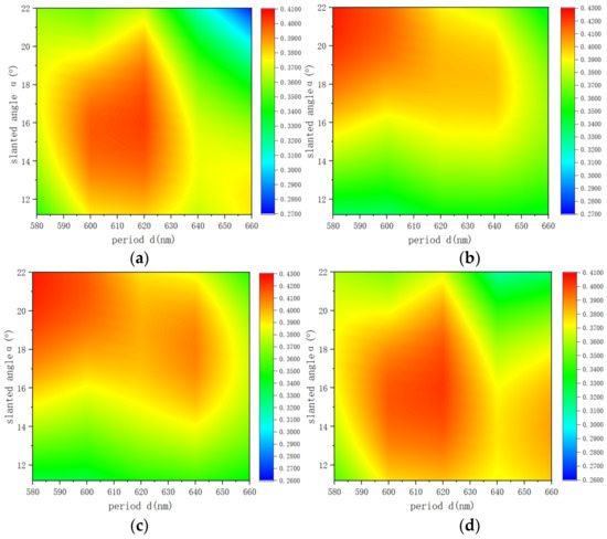 Grating diffraction efficiency versus grating period d and slanted angle α; (a) (−1, 0) order diffraction efficiency under TE polarization; (b) (0, −1) order diffraction efficiency under TE polarization; (c) (−1, 0) order diffraction efficiency under TM polarization; (d) (0, −1) order diffraction efficiency under TM polarization.