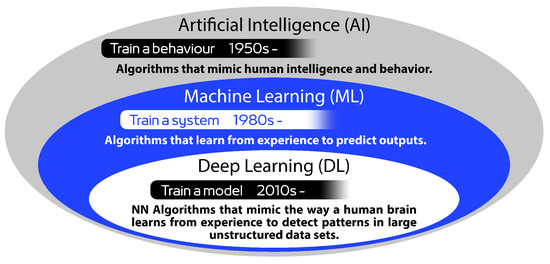 Nowadays, the term DNN is used to refer to a neural network with multiple hidden layers [21], and DNNs are categorized as a subset of ML [22,23]. Figure 2 shows the relationship between artificial intelligence (AI), ML, and DL.