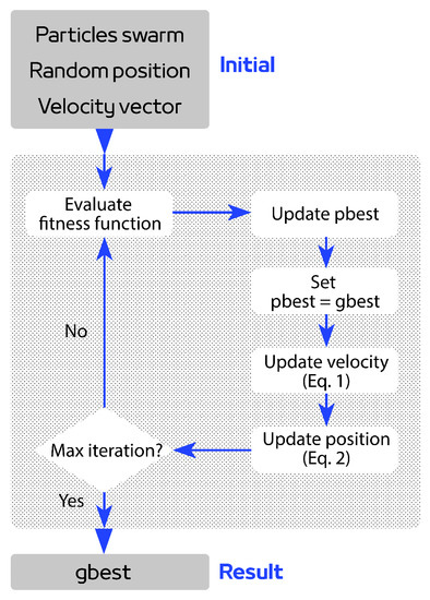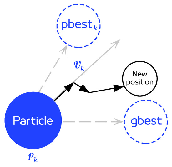 In 1995, Kennedy and Eberhart proposed the PSO algorithm [32], the goal of which was to solve optimization problems. It is a metaheuristic algorithm categorized under swarm intelligence algorithms [33]. The concept of PSO is to imitate the behavior of birds to acquire food [34]. Each bird modifies its position in the search space to achieve the best solution. Any time a bird finds a food source, it will head toward it [35]. Over the generations (iterations), every particle searches for its own optimal solution and the optimal solution in the swarm. Then, it updates the particle’s position (p) and the rate of change associated with the position (velocity). These updates will affect the personal best (pbest), and global best (gbest) values [36].