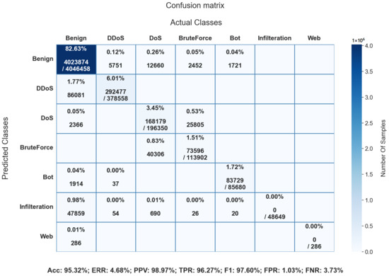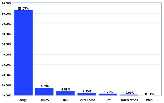 This dataset includes six primary intrusion attack types: distributed DoS (DDoS), DoS, brute force, bot, infiltration, and web attacks, as shown in Table 5 and Table 6 and Figure 6.