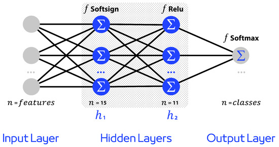 In a DNN, when the weights of hidden layers are fully connected, this is called MLP [24]. In MLP, each neuron of the network has an activation function (such as softsign, tanh, relu, etc.). MLPs are categorized under feedforward algorithms in which the data flow from the input, through the hidden layers, to the output in one direction [25].