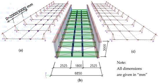 Theoretical analysis of the behaviour of these three types of connections was carried out using three different types of finite element models (FEM models) of a fictitious superstructure of a plate girder bridge with a lower member deck. The numerical models were processed with SCIA Engineer software [15]. The two models represented a common way of modelling this type of bridge when all the structural members of the superstructure were modelled with beam elements (Figure 4a,c). The stringer-to-cross-girder connection was considered once as fully hinged and once as a perfectly rigid joint. In the third model, the whole superstructure was modelled using shell elements for all load-carrying structural members (Figure 4b). Such a model allowed for a better approximation of the behaviour of the analysed type of connection at the cost of a more demanding modelling process as well as the necessary computing time.