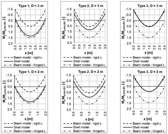 Relative bending moment diagrams My of the stringers with different span D and types of connections to the cross girder.