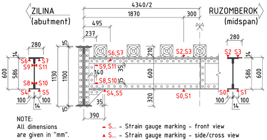 A view of the bridge and scheme of the numerical model of the superstructure are presented in Figure 7 and Figure 8, respectively. The basic geometric parameters of the bridge cross-section are evident in Figure 9. The second stringer from the support was chosen for the analysis. Its connection to the cross girder is made similarly to Type 1 in the theoretical study (Figure 5), i.e., by connecting only the webs using connecting angles but with the use of stiffening haunches. The geometric parameters of the connection as well as the placement of strain gauges installed on the chosen stringer are presented in Figure 10.