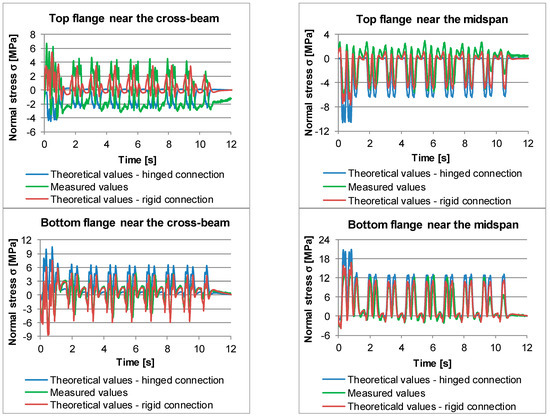 A comparison of the stress responses in the selected locations obtained from the experimental measurements as well as from the numerical simulations using the beam FEM model in Figure 8 is illustrated in the graphs in Figure 11, where the time courses of the stress response to the passing train set consisting of one electric locomotive of the 162 series and eight-passenger wagons are presented. The locomotive and each of the passenger wagons was characterised by axle forces 4 × 212.5 kN and 4 × 112.5 kN, respectively. In order to eliminate the horizontal effects of the real railway traffic load, the average values of the corresponding pairs of normal stresses recorded in the monitored locations of the bottom and top flange of the stringer were evaluated, i.e., (S0, S1) and (S2, S3) in the bottom and the top flange, respectively, in the middle of the stringer as well as (S4, S5) and (S6, S7) in the bottom and top flange, respectively, near the cross girder.