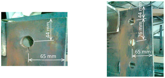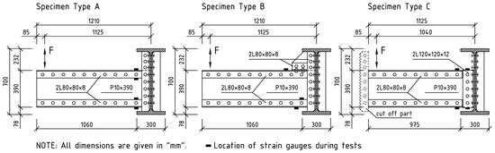 Due to the effective use of the limited possibilities of the used hydraulic pulsator as well as for economic reasons, we chose a cantilever beam loaded with a force at the free end as a static scheme when designing the test samples (Figure 12). The use of a standard simply supported stringer would require the use of up to eight times the pulsating loading force or eight times the length of the test specimen or some suitable combination. Initially, six test samples were made of steel S235 with the following guaranteed yield and ultimate strength characteristics: fy = 235 MPa, fu = 360 MPa. The I-cross-section of the stringer samples consisted of the web from steel plate P 10 × 390 mm and flanges from two angles L 80 × 80 × 8 mm. The flange angles were connected to the web by means of 22 mm diameter rivets. The stringer was connected to the cross girder of hot-rolled profile IPE 700 by means of two connecting angles L 80 × 80 × 8 mm and 16 high strength bolts M24-8.8. Three of the samples denoted as Type A were made without stiffening haunches, and three (Type B) were reinforced with triangular haunches at the connection point.