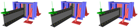 Visualizations of the shell models of the three considered types of stringer-to-cross-girder connections are illustrated in Figure 5. The bolts joining the connecting angles and webs of the stringers and cross girders as well as the splice plates and stringer flanges were modelled by means of beam elements rigidly connected with the shell elements modelling webs, flanges and angles. The shell elements modelling the cross girders were rigidly connected to the shell elements modelling the main girders including vertical stiffeners. Standard rectangular 2D finite elements were used in the mesh generation by the computational program. The average size of the 2D elements was considered to be 150 mm, with a refinement to the value of 20 mm in the case of the examined stringers and 10 mm in the case of the connecting angles. Two different spans of stringers, given by the cross girder distances D, have been considered for each investigated case in this study, namely D = 2.0 m and D = 3.0 m. Thus, 18 numerical models were processed for the needs of this study in total. In order to eliminate the global effects of the considered loads, the main girders were supported in the vertical direction at the locations of the cross-girder connections.