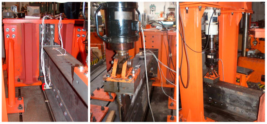 All test specimens were tested under a variable moment load induced by an alternating force acting on the free end of the cantilever with constant amplitude. The upper and lower limits of the alternating force were gradually chosen for individual samples in such a way as to induce alternating stress with different levels of the stress range at the critical section, i.e., so that the normal stresses oscillate around a zero value. The range of the loading force, and thus also the induced normal stress, were constant during the entire fatigue test of the individual sample. Normal stresses in the stringer web were noticed by means of strain gauges located according to Figure 12. Illustration photos from the fatigue tests are presented in Figure 14.