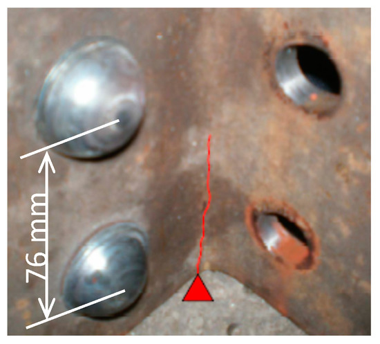One of the typical cases of fatigue damage on steel riveted bridges is a fatigue crack in the web of the stringer at the point of its connection to the cross girder (Figure 1), which is realised only by connecting the webs of the stringer and the cross girder to each other using connecting angles while the flanges of the adjacent stringers are not connected. At the time of the design of the mentioned types of bridges, such a connection was commonly considered to transmit only axial force and shear force in the plane of the web. Based on this simplifying assumption, no fatigue crack was expected to develop in this detail during the bridge service life. However, the relatively frequent occurrence of fatigue cracks indicates the incorrectness of this assumption. To explain this phenomenon, it is possible to consider that, although not great, a certain real bending stiffness of this connection has resulted in higher normal stresses in the web of the stringer at the upper edge, mainly tensile, due to hogging moment. Increased concentration of normal stresses usually in the place of the first rivet connecting the web plate and the flange angles, in combination with a large number of loading cycles, have led to the initiation and subsequent growth of a fatigue crack. The bending stiffness as well as the fatigue resistance of the stringer-to-cross-girder connection is the subject of several works, e.g., [13,14]. However, they are focused on fatigue cracks in the connecting angles as well as rivet failures, not on cracks in the stringer web as shown in Figure 1.