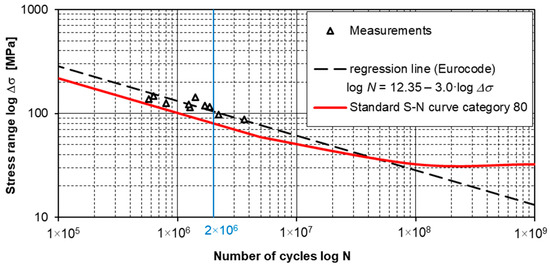 - Based on the linear regression analysis of the obtained test results, the fatigue category of the investigated detail was determined, given by the fatigue strength value ΔσC = 80 MPa corresponding to the number of load cycles of 2 × 106.