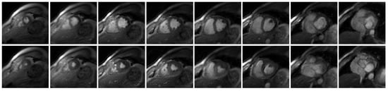 Showcase of the reconstruction of free-breathing and ungated cardiac MRI using the proposed deep kernel method. The eight slices are from Subject #2. The first row shows the end-diastolic phase, and the second row is the end-systolic phase.