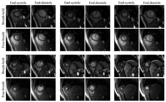 Visual comparison of the reconstructed free-breathing images and the fully-sampled breath-hold images. End-systolic and end-diastolic phases from six slices are shown in the figure. The six slices are from Subject #4. We note that the free-breathing images are acquired using the GRE sequence and the fully-sampled breath-hold images are acquired using the bSSFP sequence. This results in different contrast between the two types of the images.