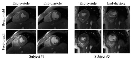 Visual comparison of the reconstructed free-breathing images and the fully-sampled breath-hold images acquired using FGRE sequence. For each subject, we acquired fully-sampled breath-hold images for one middle slice using the FGRE sequence. End-systolic and end-diastolic phases from two slices from two subjects are shown in the figure.
