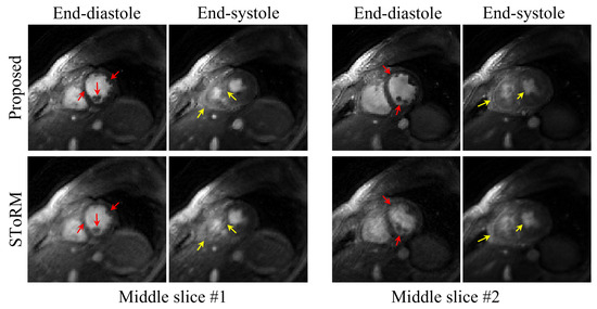 Comparison of the reconstructions from the proposed method and the SToRM method. We showed the end-diastolic and end-systolic phases from two slices acquired from Subject #1. From the images, we can see that the proposed reconstruction scheme can provide images with sharper edges, and the papillary muscles are more visible (illustrated by the red arrows in the images). Furthermore, from the end-systolic images, we can see that the proposed scheme provides reduced motion artifacts, and the RV free-wall is more clear (illustrated by the yellow arrows in the images).