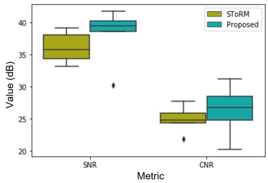 SNR and CNR comparison of the images reconstructed from the proposed scheme and the SToRM method. The average SNR and CNR of the images reconstructed from the proposed method are 37.99 dB and 26.28 dB. While the average SNR and CNR of the images reconstructed from SToRM are 36.01 dB and 24.89 dB. From the quantitative comparison, we can see that the proposed deep kernel method can provide improved image quality compared to the existing kernel method.