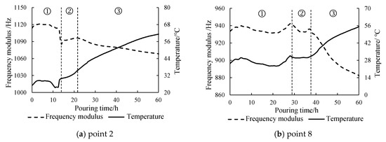 Strain sensors can reflect the change of concrete from a plastic flow state to the final setting state from the beginning of embedding to the process of synchronous deformation with concrete. Therefore, it is necessary to analyze the early monitoring data to better understand the concrete condensation process. Vibrating string strain sensors use the relationship between the vibration frequency and the strain to reflect the strain condition by measuring the vibration frequency change of steel string under stress. Taking two and eight measuring points as examples, the initial frequency modulus and temperature reading of the strain from pouring are shown in Figure 4.