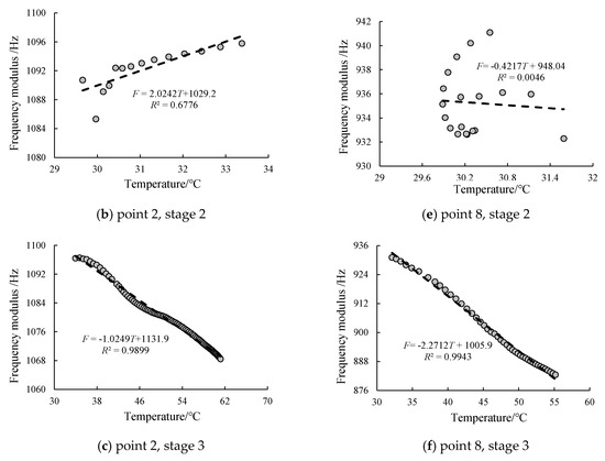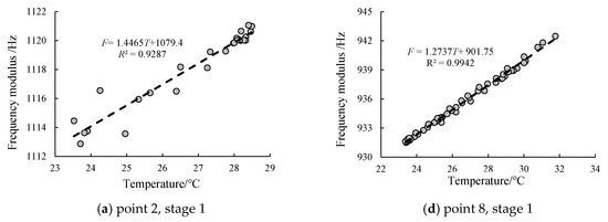 According to Section 2, the early strain response of the structure mainly depends on its temperature effect. To understand the correlation more fully between the strain and temperature data in each early stage and further reflect the process of concrete condensation, a linear regression model is established for strain frequency modulus and temperature data.