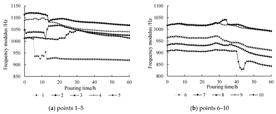 The selection of the effective strain starting point is very important for subsequent strain analysis. Because the deformation after the final setting is the effective deformation, the final setting time can be judged as the monitoring zero point to transform and analyze the initial strain. The initial frequency modulus of each measuring point is shown in Figure 6.