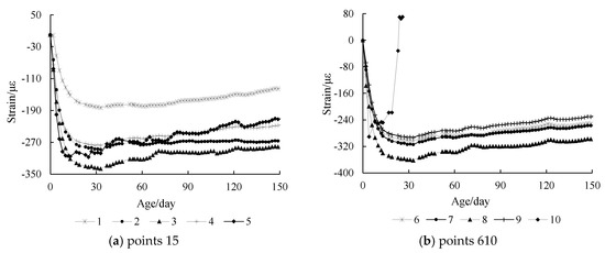 According to the conclusion obtained in Section 5.1, the final setting time is taken as the starting point of effective deformation of each measuring point, and the strain conversion is carried out by Formula (10). The strain of each point is shown in Figure 7.
