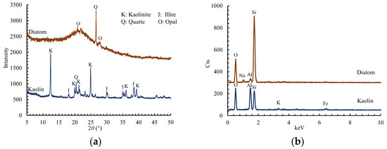 The studied soil was a diatom–kaolin mixture (DKM) comprising Georgia kaolin (RP-2; Active Minerals International, Baltimore, MD, USA) and diatom from Changbai Prefecture, Jilin, China. Figure 1 gives the mineral and chemical compositions of kaolin and diatom as revealed by X-ray diffraction and X-ray energy-dispersive spectroscopy: diatom comprises quartz and opal with no clay minerals, which is consistent with the high contents of Si and O elements; kaolin has a dominant mineral content of kaolinite with traces of illite and quartz, in which the content of illite and quartz are ca. 1.8% and 1.2%, respectively. Table 1 summarizes the physical properties of the diatom and kaolin as determined by ASTM standards. Diatom has lower GS (2.25), significantly higher specific surface area (179.5 m2/g), higher activity (Ad) (0.87), and cation exchange capacity (32.3 meq/100 g) compared with kaolin.