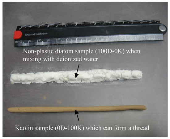 In this study, the wp of the soil was determined using thread-rolling tests following ASTM D4318-17 [24], while the wL was determined by fall-cone tests, which give less variable experimental results compared to the standard “Casagrande cup” method [25,26,27]. Note that a thread-rolling test was inappropriate for sample 100D-0K because of the non-plastic nature of pure diatoms (Figure 2); therefore, the method proposed by Vardanega et al. [28] was used to determine wp for pure diatoms from the correlation between IP and the flow index of the fall-cone test. Additionally, the PSD curves of the prepared DKM samples were obtained to determine their clay and silt fractions; for this, the hydrometer method [29] was used because the DKM samples contained no coarse particles (>0.075 mm).