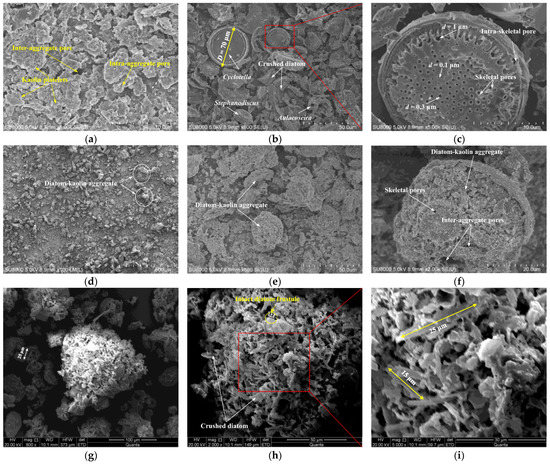 Scanning electron microscopy images of (a) kaolin (0D-100K) (b,c) diatoms (100D-0K), (d–f) a DKM (60D-40K), and (g–i) crushed diatoms.
