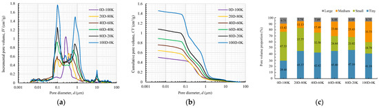 Results of mercury intrusion porosimetry tests on DKM samples: (a) IV–d curves; (b) CV–d curves; (c) volume proportion of pores with different diameters.