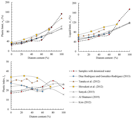 The Atterberg limits of DKM samples with varying diatom contents are presented in Figure 6, along with the values of wL, wp, and IP for different DKMs from previous studies [6,12,31,32,33,34]. The more diatoms in the DKM, the higher wL and wp are. The Atterberg limits of DKM with a diatom content of 0–60% are lower than DKM with a diatom content of 80–100%; for example, sample 60D-40K has wL = 70% and wp = 46%, while sample 80D-20K has the higher values of wL = 128% and wp = 98%. However, although wL and wp of the DKM change significantly with diatom content, IP remains relatively stable because the increments in wL and wp are approximately the same. Notably, wL and wp increase remarkably when the diatom content increases from 60% to 80%. Some previous studies [12,35] suggested that the correlation between increasing wL and wp and diatom content is because wL and wp are affected by the unique microstructure of diatom frustules.
