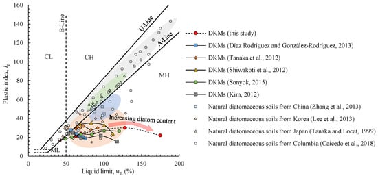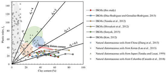 The relationships between IP and wL for various DKMs are shown in Figure 7 as a Casagrande plasticity chart, along with data points for natural diatomaceous sediments from China [5], Korea [3], Japan [2], and Columbia [4]. The data points in Figure 7 for DKM samples move rightward with increasing diatom content, indicating that the plasticity of a DKM is hardly affected by its diatom content. Additionally, all of the DKM data points fall below the A-line, whereas the data of natural DSs are above the A-line and approach the U-line, as shown by the colored areas in Figure 7. The higher positions of the data points for natural DS compared with those for artificial DKM samples may be due to the existence of high plasticity mineral montmorillonite [1,35]. Figure 8 shows the relationships between IP and clay content for DKMs and natural DSs, where the slope of the curve represents soil activity Ad. The Ad value increases with the clay fraction and the DKM data points change from the line of Ad = 0.5 to Ad = 1, which is consistent with the findings of Shiwakoti et al. [12].