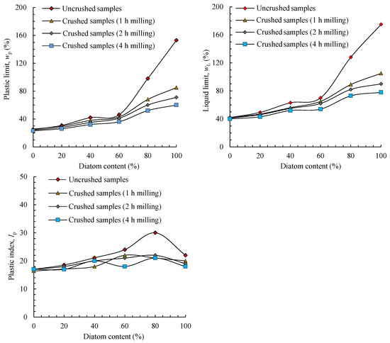 Figure 9 shows how diatom crushing affects the Atterberg limits of the DKM samples. The crushed DKM samples have lower wL and wp values than uncrushed ones. In particular, this difference in wL and wp between crushed and uncrushed DKMs is more remarkable for samples 80D-20K and 100D-0K. The wL values of crushed 80D-20K (58.4%) and 100D-0K (62.4%) are much lower than those of uncrushed 80D-20K (128%) and 100D-0K (175%). This pattern of wL is similar to wp. The results mean that the high wL and wp values for samples 80D-20K and 100D-0K are due mainly to the intact microstructure of the diatoms. As shown in Figure 3h,i, crushed diatom fragments form a chain-like structure that cannot store water, because the water in the crushed diatom can only be stored in the skeletal pores of the fragments and not in the intra-skeletal pores.