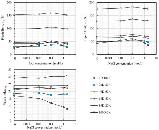The Atterberg limits of kaolin are affected by NaCl concentration, whereas those of pure diatoms are almost unaffected. Similar to the consistency limits of pure diatoms, the wL, wp, and IP values for a DKM with even a small proportion of diatoms (20%) are insensitive to NaCl concentration.