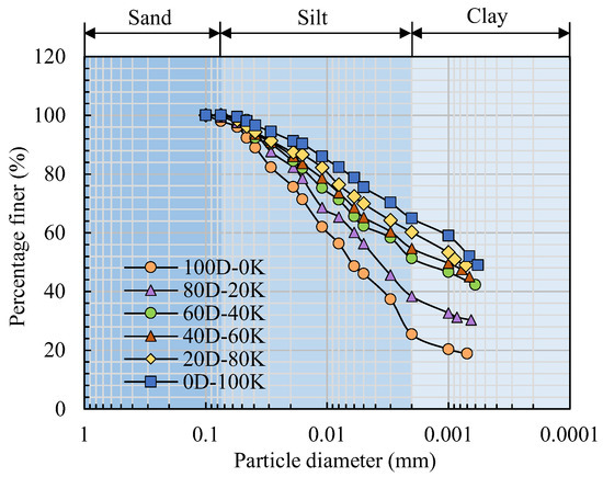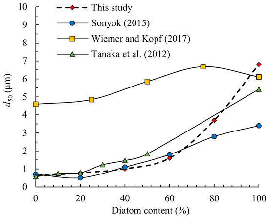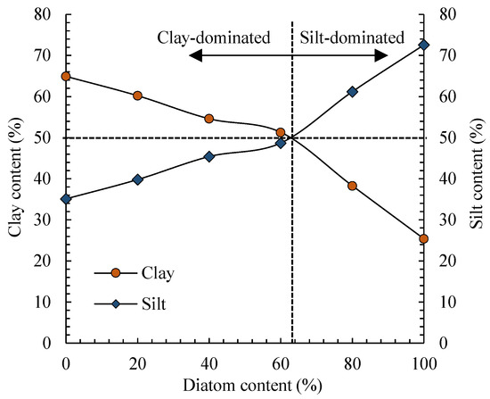 Before classifying the DKM samples, their particle size compositions are obtained from the PSD curves (Figure 12). The diatoms comprise mainly silt, while the kaolin contains more clay than silt. The PSD curves of the DKM samples move downward with increasing diatom content. Higher diatom content in the DKM corresponds to more silt and less clay (Figure 13), and DKM with a diatom content of more than 60% has a dominant composition of silt and is known as silt-dominated soil. Figure 14 shows that the d50 value of the DKM increases with increasing diatom content: d50 increases by 131% when the diatom proportion changes from 60% to 80%. Similar phenomena have been observed in previous studies [6,32], except for that by Wiemer and Kopf [19], who used clayey silt as a substitute for kaolin to prepare the studied DS.