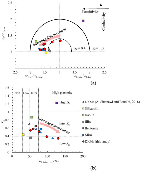 Jang and Santamarina [27] proposed a classification system for fine-grained soil based on pore fluid sensitivity. This classification focuses on the different types of interparticle interaction (i.e., van der Waals and double-layer effects) in fine-grained soil. It uses electrical sensitivity (SE) to measure the permittivity and conductivity of the soil. SE is calculated using the fall-cone liquid limits, which are measured with different pore fluids of deionized water, 2-M NaCl solution, and kerosene (i.e., wL,DW, wL,brine, and wL,ker, respectively). Figure 15 shows the classification results according to this system for different types of DKM and the DS studied by Al Shatnawi and Bandini [7], along with those for silica silt, kaolin, and other minerals (i.e., mica, bentonite, and illite). With increasing diatom proportion, the permittivity decreases, and the conductivity increases slightly, which results in decreasing SE (Figure 15a). As shown in Figure 15b, a DKM with a diatom content of less than 40% is classified as “intermediate plasticity, intermediate SE”, while one with a diatom content of more than 80% is classified as “high plasticity, low SE”. Sample 60D-40K is classified as “high plasticity, intermediate SE”. However, the pore fluid sensitivity classification recognizes pure diatoms as high plasticity soil, although this sample is confirmed to be non-plastic (Figure 2).