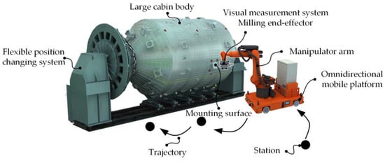 The large cabin of a spacecraft is an important part of space information transmission equipment and core weapons of military defense, as well as a major guarantee for national security and the national economy. Its development level is a concentrated reflection of the manufacturing capability of high-end aerospace equipment. A large spacecraft cabin has the significant characteristics of large size, being lightweight, having a complex structure and so on. At present, existing research outcomes for the large cabin body multi-mounting surface combination milling mostly use large special machine tools or off-line split processing combined with an online repair manufacturing mode. But there are still problems such as unstable and complex process, poor flexibility, long cycle and so on. In recent years, the in-site machining operation mode of mobile robots has emerged with a strong environmental adaptability and high processing efficiency, which has become an effective way to solve the problems of efficient and high precision manufacturing of the large spacecraft cabin [1,2,3]. For example, the mobile robot processing system for large aircraft parts studied by the Fraunhofer Association [4], the mobile robot wind turbine blade grinding system proposed by KUKA and the KUKA MRP robot arm movement base oriented towards aircraft skin hole assembly [5], and the mobile processing robot equipment for aircraft fuselage drilling and riveting developed by Zhejiang University [6], etc.
