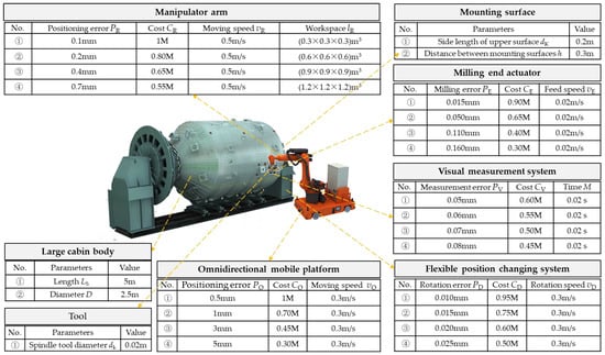 Based on the above analysis, the measured data was first collected and summarized, and the component set was initialized as shown in Figure 6. The precision, efficiency and cost of omni-directional mobile platform, manipulator, milling end actuator, visual measurement system and flexible displacement system are related. The manuscript directly gives the results of the relationship among precision, efficiency and cost through the existing data, without detailed analysis.