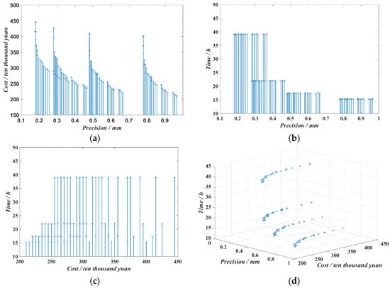 The non-inferior solution set for optimal system construction. (a) Construction of error and cost optimal system; (b) Construction of optimal error and time-consuming system; (c) Construction of cost and time-consuming system; (d) Optimal system construction for error, cost and time.