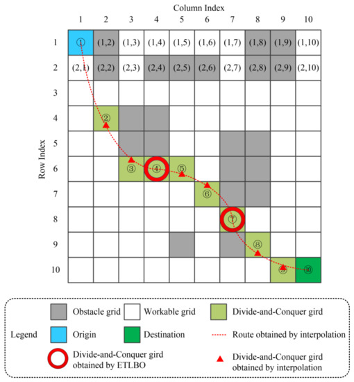 It can be observed from Figure 4 that some divide-and-conquer grids are to be optimized by the solution array of the ETLBO, such as grids ④ and ⑦, while the other divide-and-conquer grids are obtained by the interpolation method. In the case in which an interpolated grid is located at an obstacle grid, the nearest workable grid in that column is selected as the divide-and-conquer grid. In this regard, the B-Spline interpolation method is selected to pave the way for ELTBO deployment according to some existing MRPP-related studies [26].